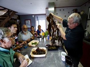 Un savoir-faire venu des abers ! Après une tartine de pain au nori, le rythme s’accélère ! Découpage, cuisson, mixage…s’enchaînent pour les makis, les feuilletés de la mer, un mignon de porc aux laminaires, un bavarois aux fruits rouges. Un menu impressionnant ! Mais avec l’intarissable Pierrick, tout paraît simple. On observe, on prend note. Le voir à l’œuvre est un bonheur. Tous les sens sont conviés à la fête. Les algues deviennent vert vif à la chaleur. D’appétissants arômes titillent nos narines. Sur la planche, le couteau rythme la découpe des haricots de mer. Au détour d’une casserole, on retient une astuce de pro, pour écraser du poivre de Sichuan, geler un coulis avec de l’Agar-agar, positionner les ingrédients afin de bien rouler les makis…Tours de main ou tours de magie ?
